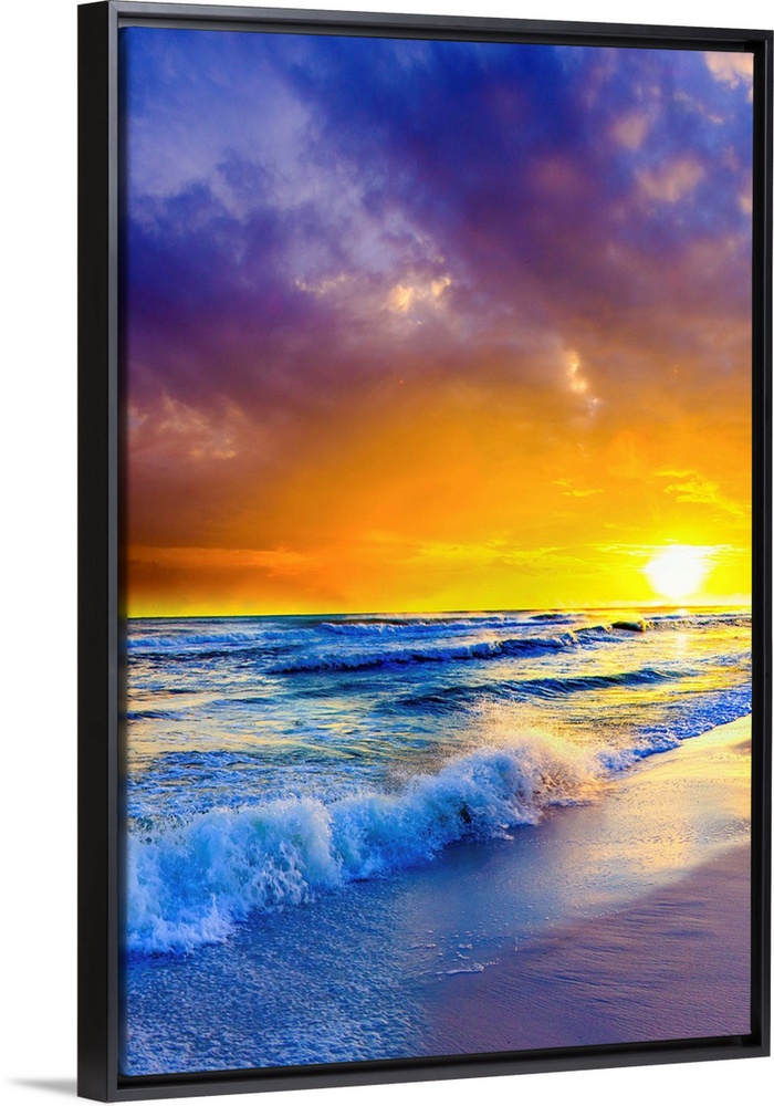 <p>Purple clouds reach out beyond an orange sunset over the ocean. A great sunset to print on canvas.</p>