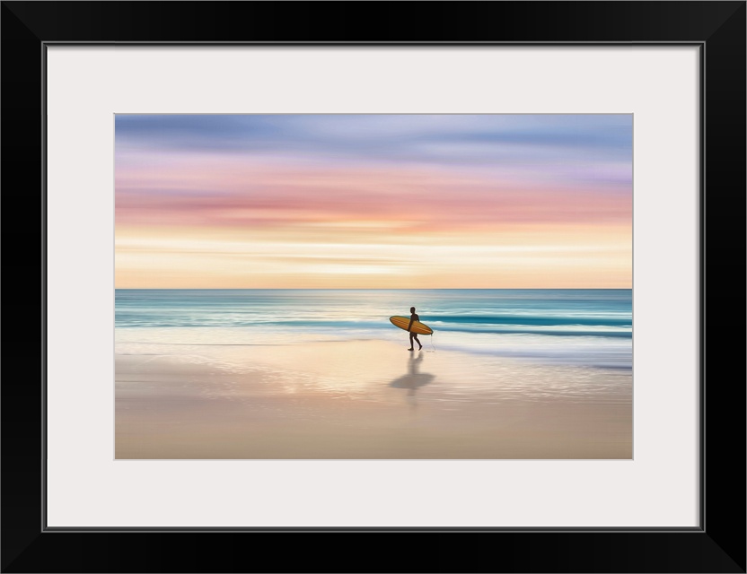 <p>A minimal contemporary painting of a person walking in the waters edge at sunrise, carrying a surfboard</p>
