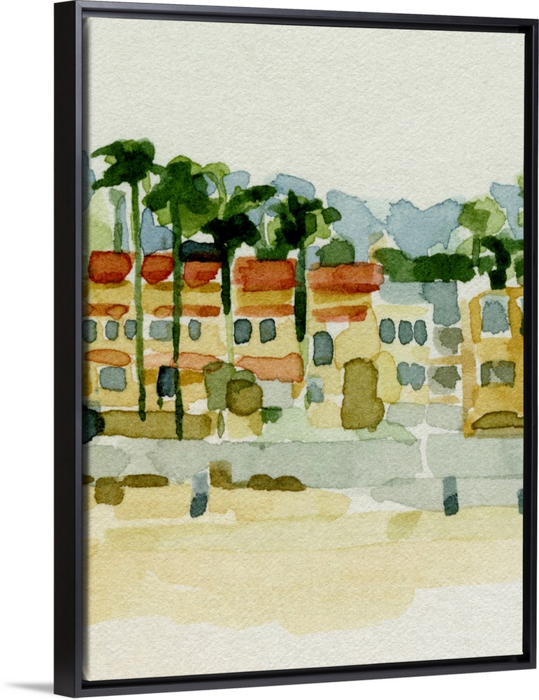 <p>A very simple, abstracted watercolor painting of row houses and palm trees with a beach in front</p>