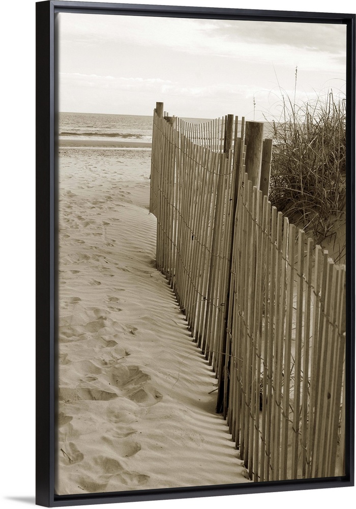 <p>Sepia toned photograph of sand dune fences making a path leading to the beach.</p>