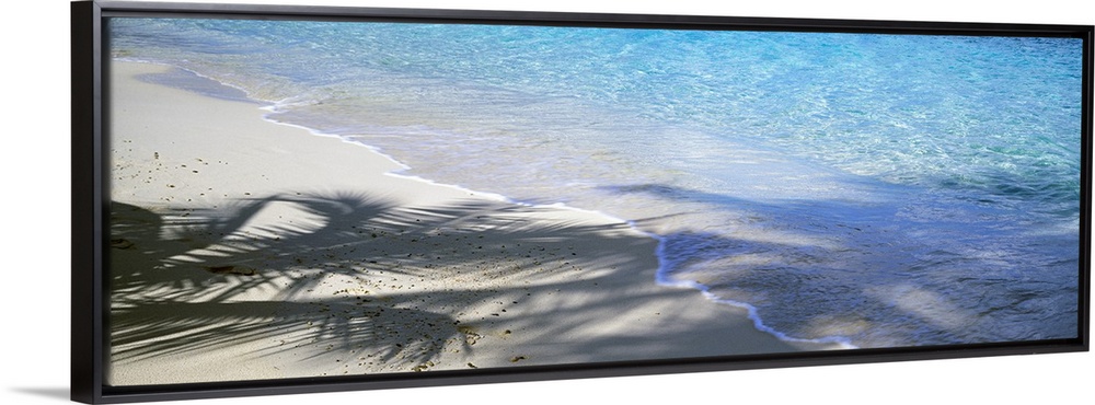 <p>Panoramic shot of a beach with crystal clear water rushing up onto the sand that is partially shadowed by palm trees.</p>