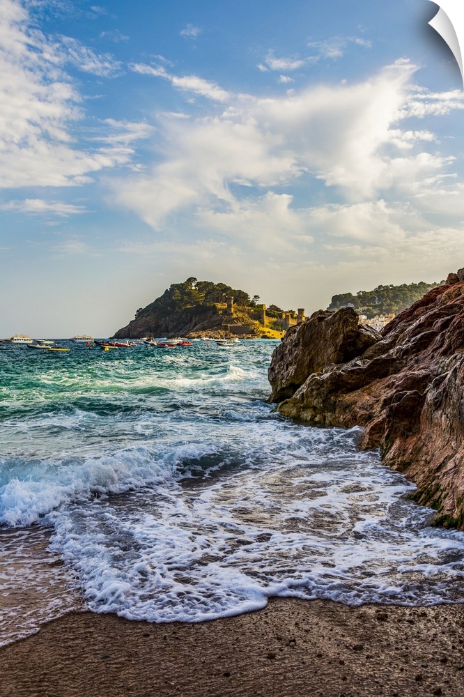 <p>Beach view from Tossa de Mar of Castell de Tossa, which was built in 1187; Tossa de Mar, Girona, Spain</p>