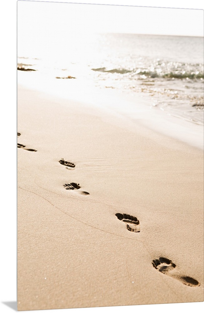 <p>Photograph of a line of footprints in the sand in front of the ocean.</p>