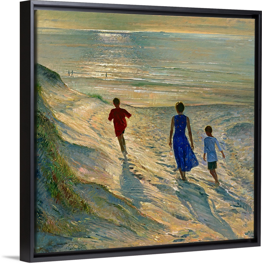 <p>This large contemporary painting has a mother and two sons walking through dunes and onto the beach at sunset.</p>