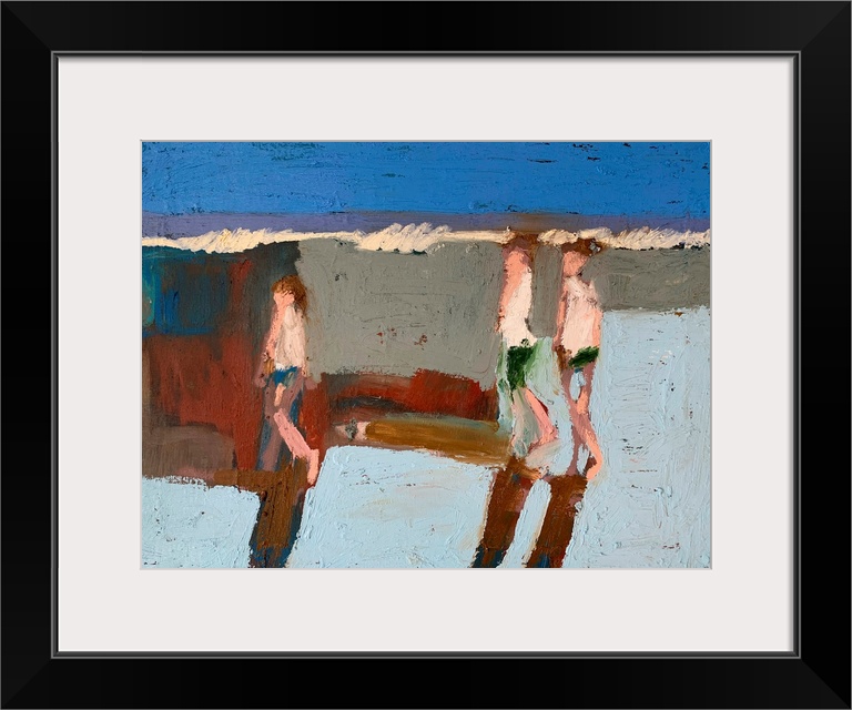 <p>A very blocky, abstracted contemporary painting of three figures walking in front of low waves tumbling onto the beach</p>