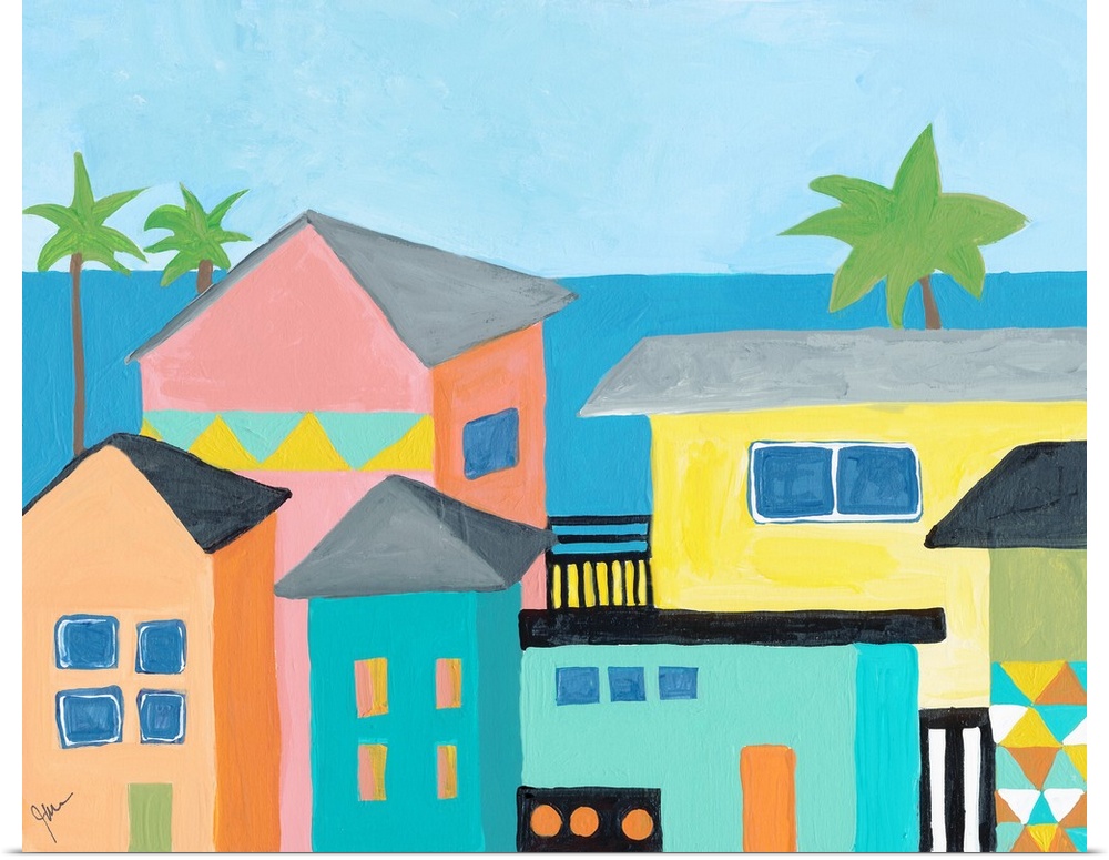 <p>Contemporary painting featuring several colorful houses on the coast, with the ocean and palm trees.</p>