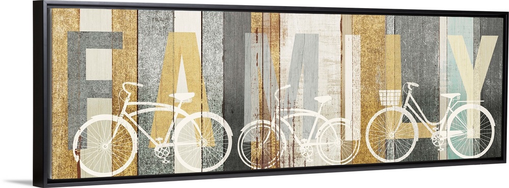 <p>"FAMILY" painted on wood panels with white silhouettes of bicycles.</p>