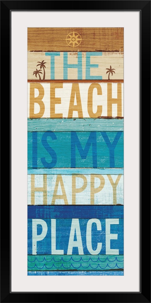<p>"The Beach Is My Happy Place" on a blue and tan wood paneled background.</p>