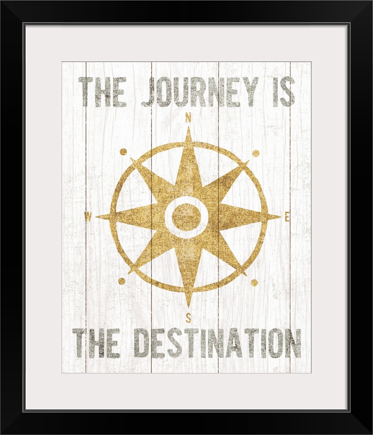 <p>Metallic gold rose compass and the phrase "The Journey Is The Destination" on a white wood paneled background.</p>