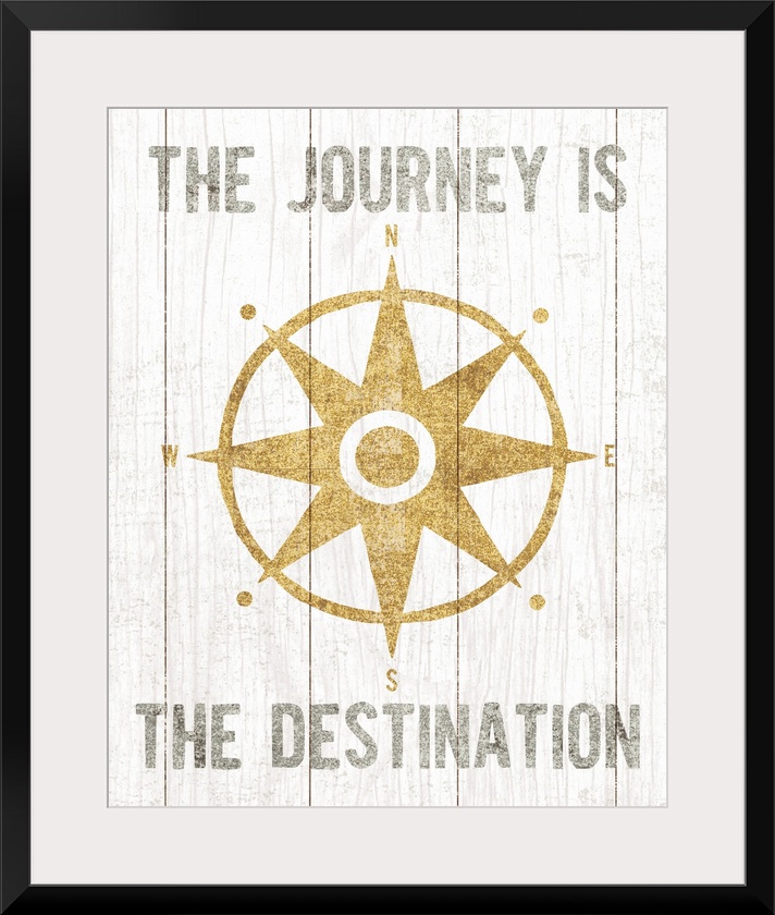 <p>Metallic gold rose compass and the phrase "The Journey Is The Destination" on a white wood paneled background.</p>
