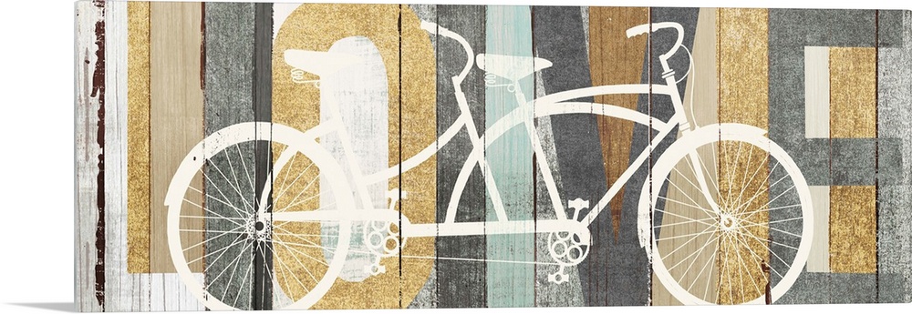 <p>"LOVE" painted on a wood paneled background with a white silhouette of a tandem bicycle on top.</p>