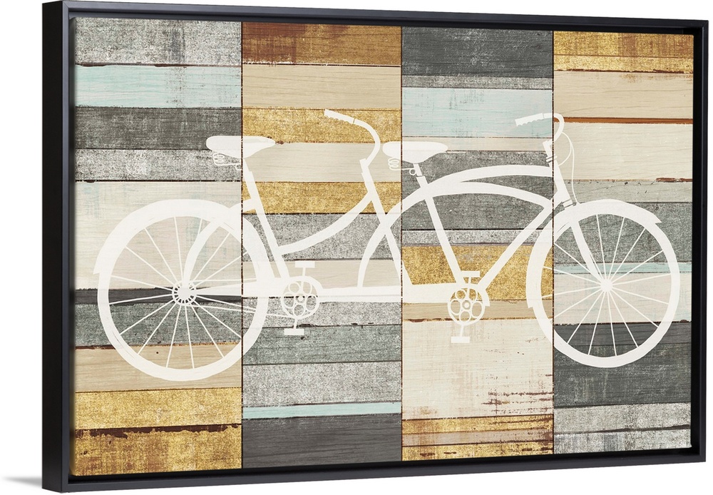 <p>White silhouette of a tandem bicycle on a painted wood paneled background.</p>