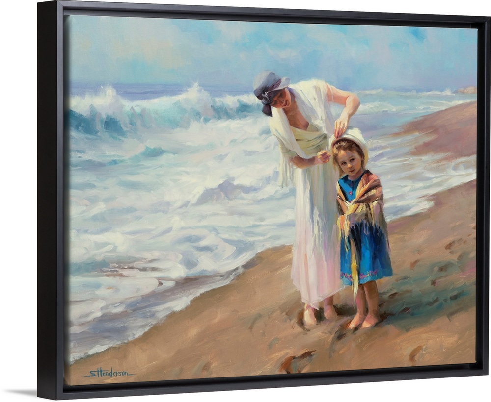 <p>Traditional representational painting of a mother and daughter at the beach. The girl is wearing a white shawl and her mother is fixing her hat.</p>