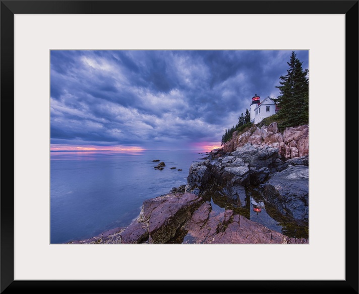 <p>Photograph of a white lighthouse on the coast of Maine, with the sun setting under big textured fluffy clouds.</p>
