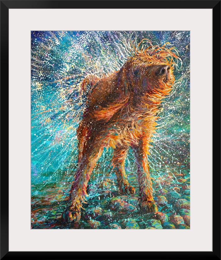 <p>Brightly colored contemporary artwork of a dog shaking water off.</p>