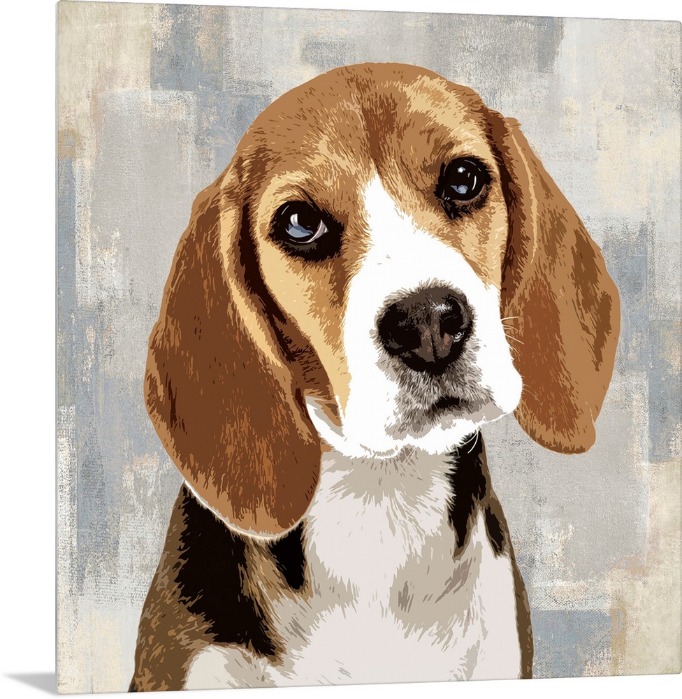 <p>Square decor with a portrait of a Beagle on a layered gray, blue, and tan background.</p>