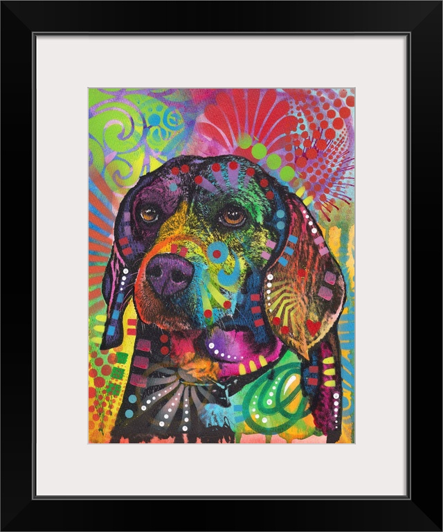 <p>Pop art style illustration of a beagle with colorful markings all over and a graffiti background.</p>