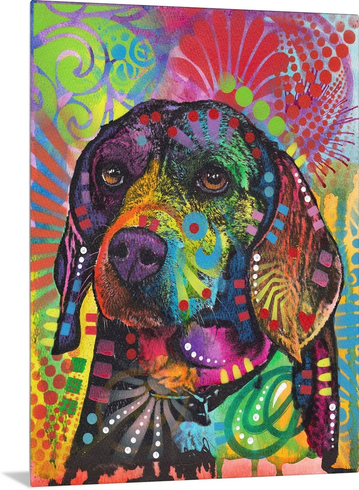 <p>Pop art style illustration of a beagle with colorful markings all over and a graffiti background.</p>