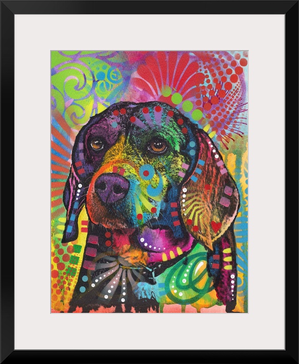 <p>Pop art style illustration of a beagle with colorful markings all over and a graffiti background.</p>