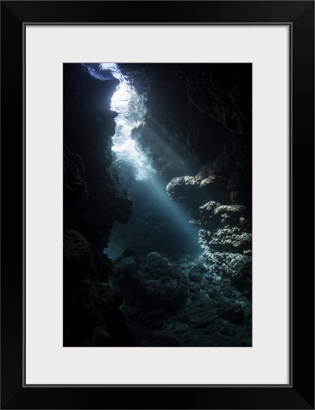 <p>Beams of light descend into the darkness of a cavern in the Solomon Islands.</p>