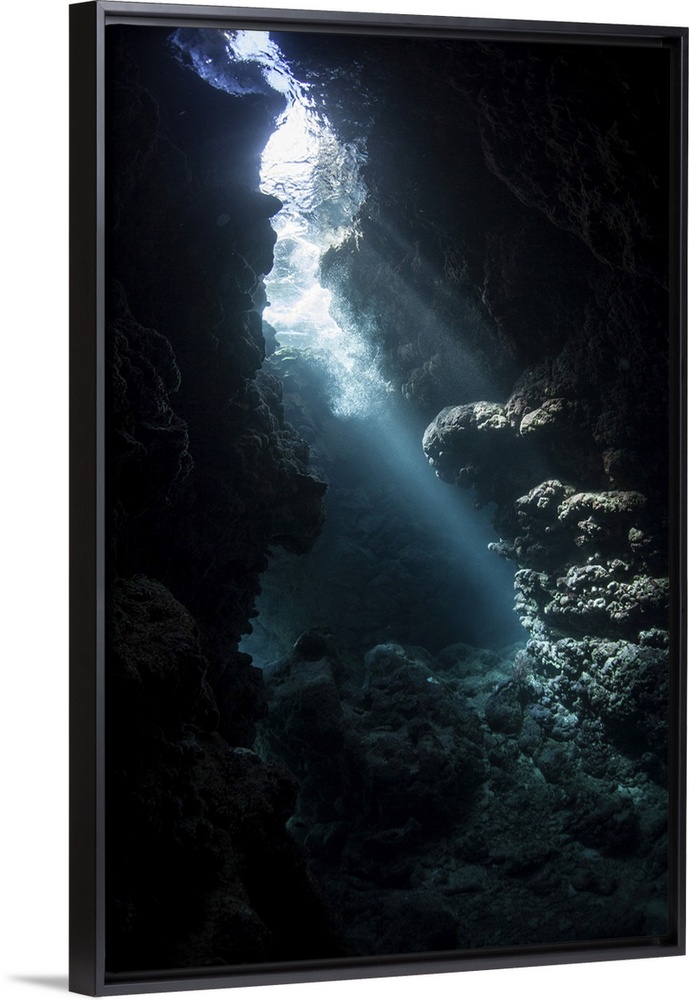 <p>Beams of light descend into the darkness of a cavern in the Solomon Islands.</p>