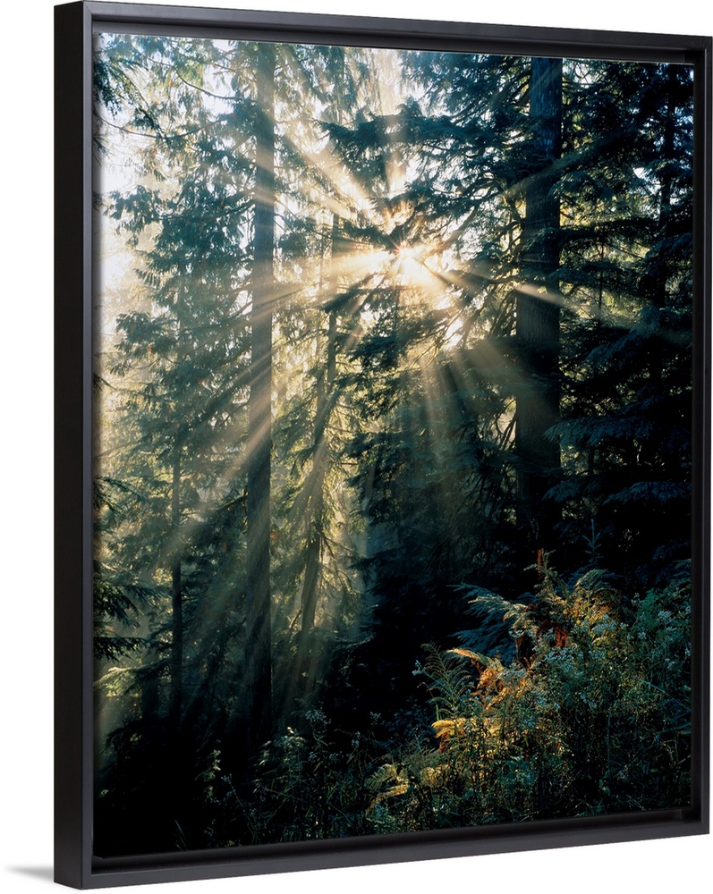 <p>Beams of sunlight shining through trees, Mount Rainier national park. Washington, united states of America.</p>