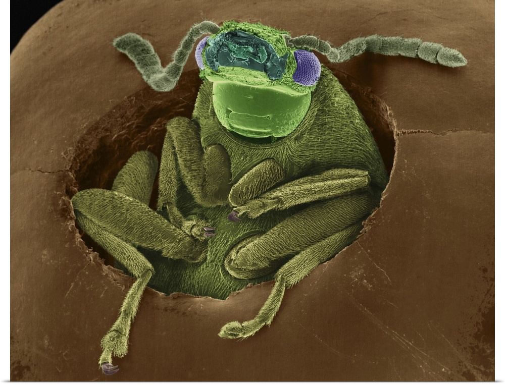 <p>Coloured scanning electron micrograph (SEM) of Bean weevil emerging from a bean seed (Acanthoscelides obtectus). Acanthoscelides obtectus is a bean weevil from the family Chrysomelidae. It is and agriculture pest and is distributed worldwide. It primarily attacks stored beans but may attack bean plants in the field. Adult bean weevils feed on bean plant foliage and seed pods. Females lay eggs inside the seed in storage or lay multiple eggs on the surface of a pod in the field. Larvae develop in growing or stored bean seeds. After pupation within the seed, the adult chews an exit hole through the seed coat. Magnification: x9 when shortest axis printed at 25 millimetres.</p>