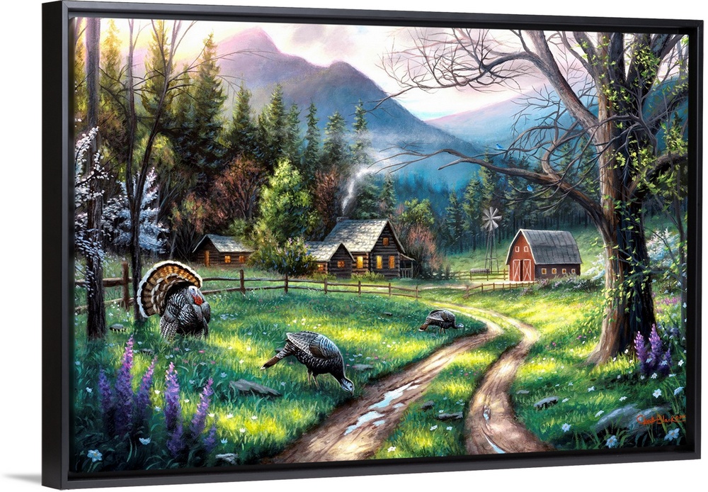 <p>Contemporary landscape painting with a dirt road in the center leading to log cabins and a barn with wild turkeys on the side.</p>