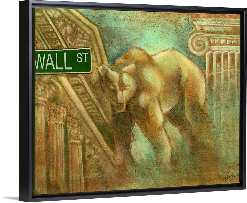 <p>Horizontal artwork for an office of a large, illustrated bear, glaring as he stands in front of part of the New York Stock Exchange building. The Wall Street road sign in the upper left of the image.</p>