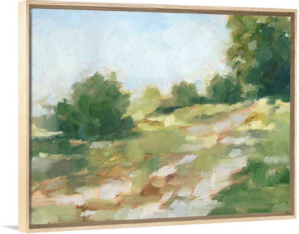 <p>Contemporary abstract painting of a path flowing through a green landscape.</p>