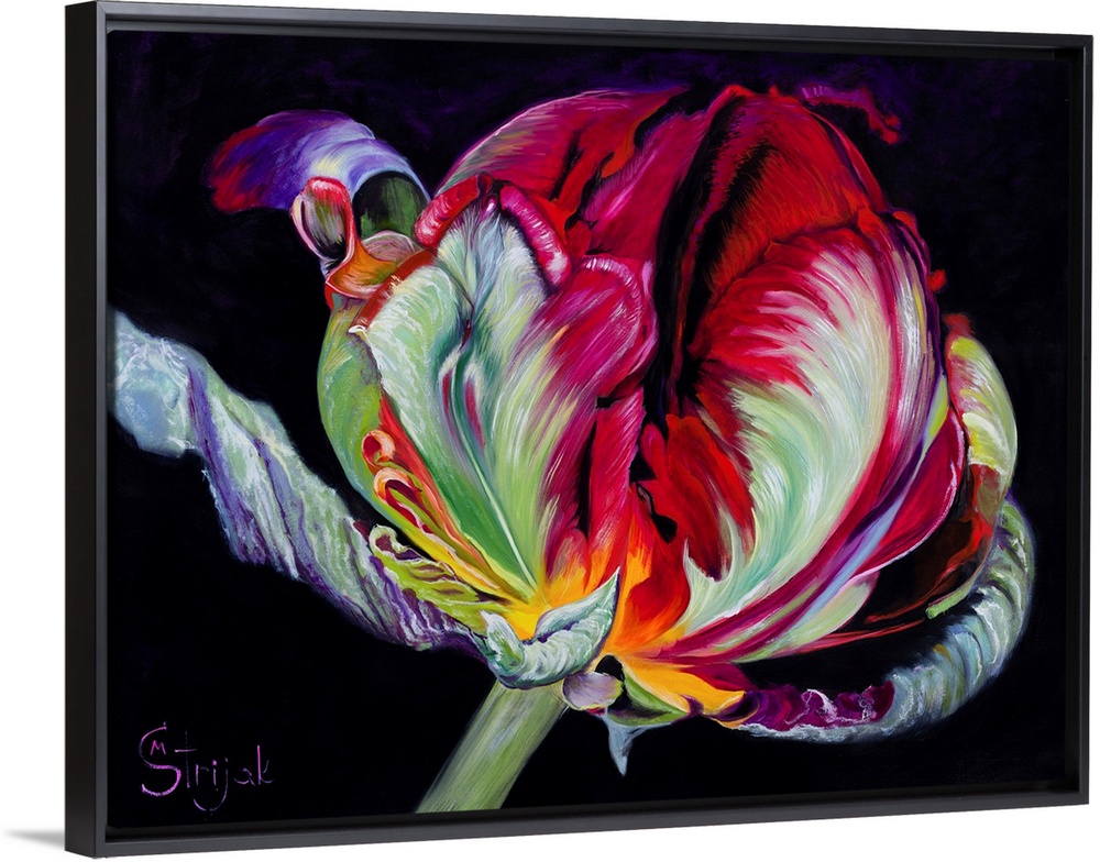<p>Red parrot tulips are intricate, delicate, and beautiful flowers. In this painting, the black background makes the transition of bright colors on the petals especially dramatic.</p>