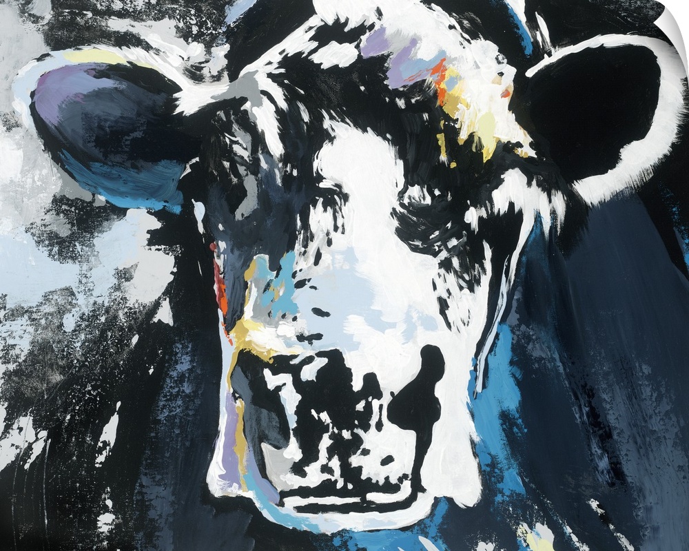 <p>Abstract painting of a cow with shades of blue and white and small pops of purple, yellow, and orange.</p>