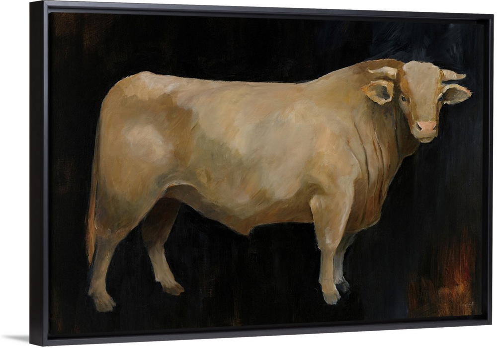 <p>Contemporary painting of a brown cow on a dark background.</p>