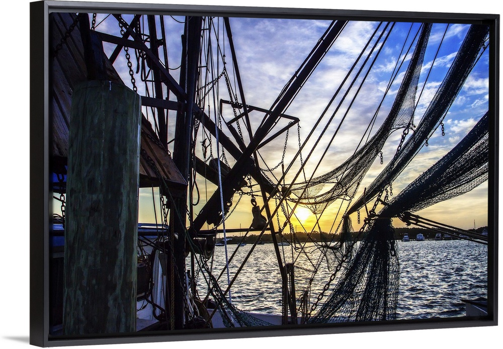 <p>Photograph of the sunrise though boat lines and nets.</p>