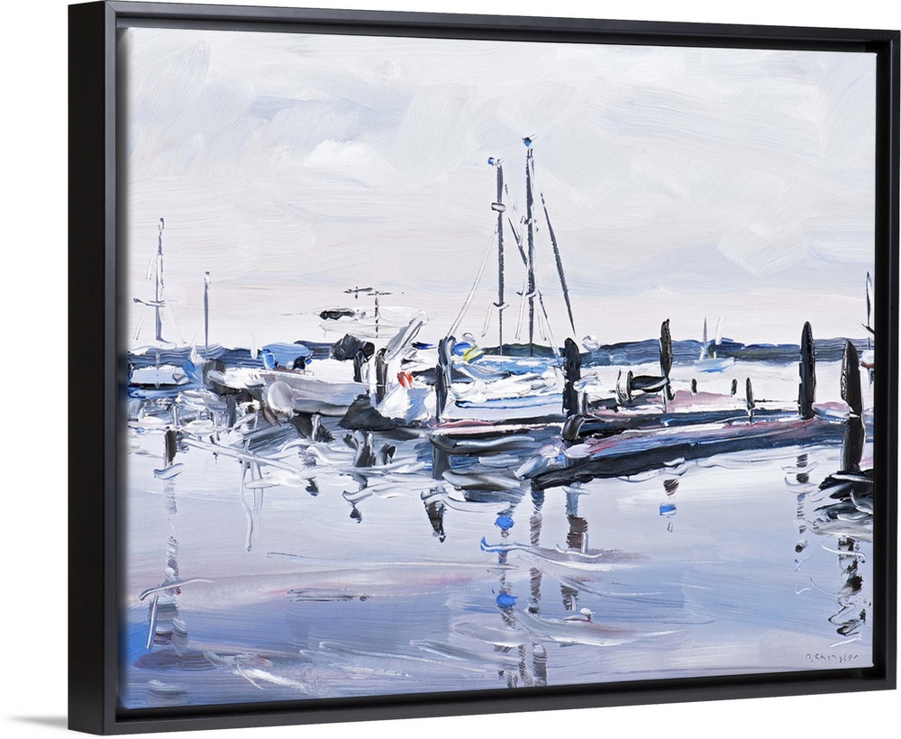 <p>Contemporary painting of a harbor filled sailboats under a gray sky.</p>