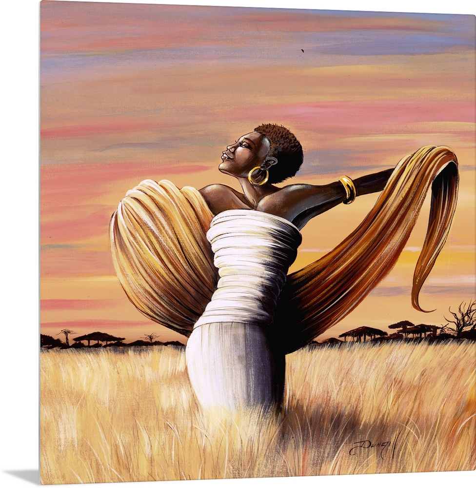 <p>Contemporary African painting of a woman in a field raising her arms.</p>