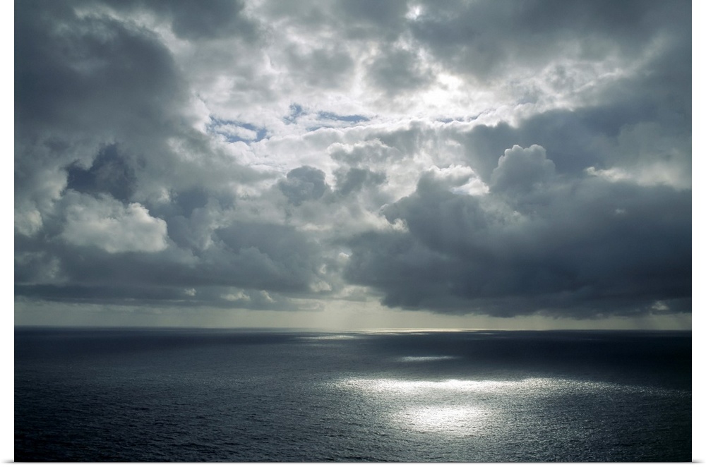 <p>Beautiful clouds formations hover over tranquil water with sunlight reflections and a storm in the distance. Alaska, united states of America.</p>