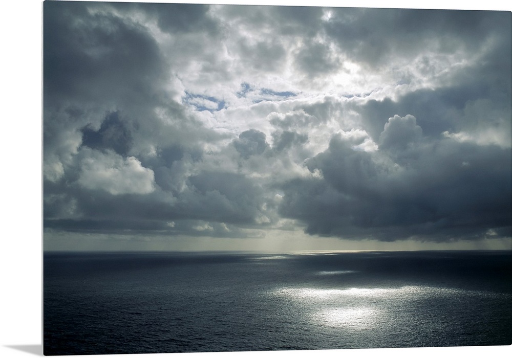 <p>Beautiful clouds formations hover over tranquil water with sunlight reflections and a storm in the distance. Alaska, united states of America.</p>