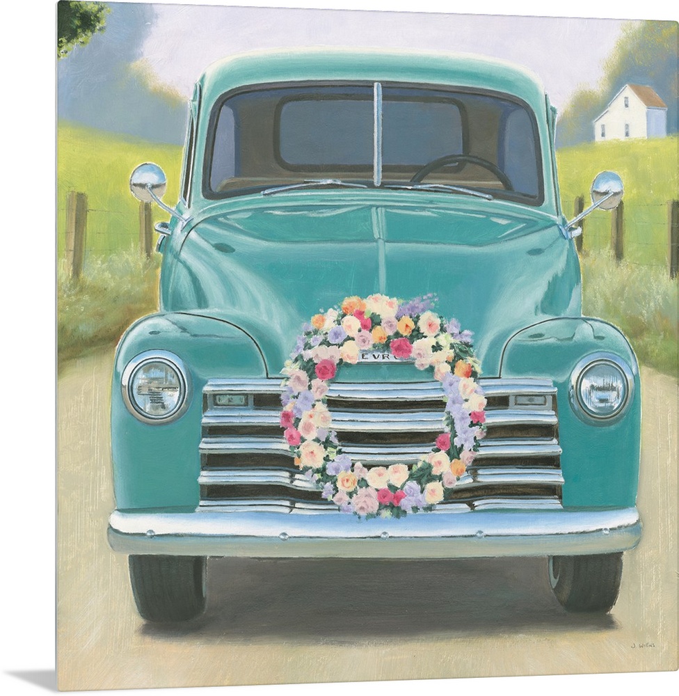<p>Square contemporary painting of a vintage teal truck with a wreath of flower on the front.</p>