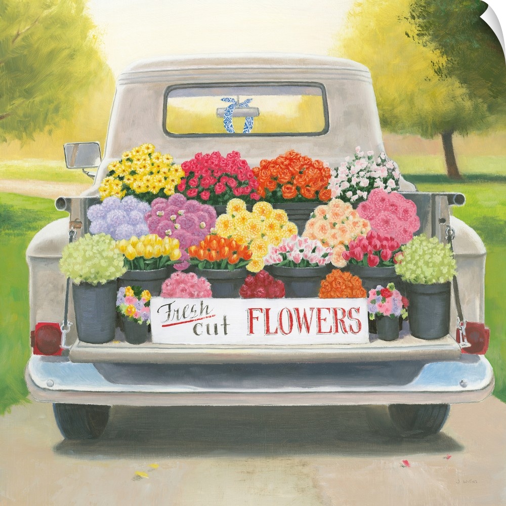 <p>Square contemporary painting of a vintage truck bed full of fresh cut flowers for sale.</p>