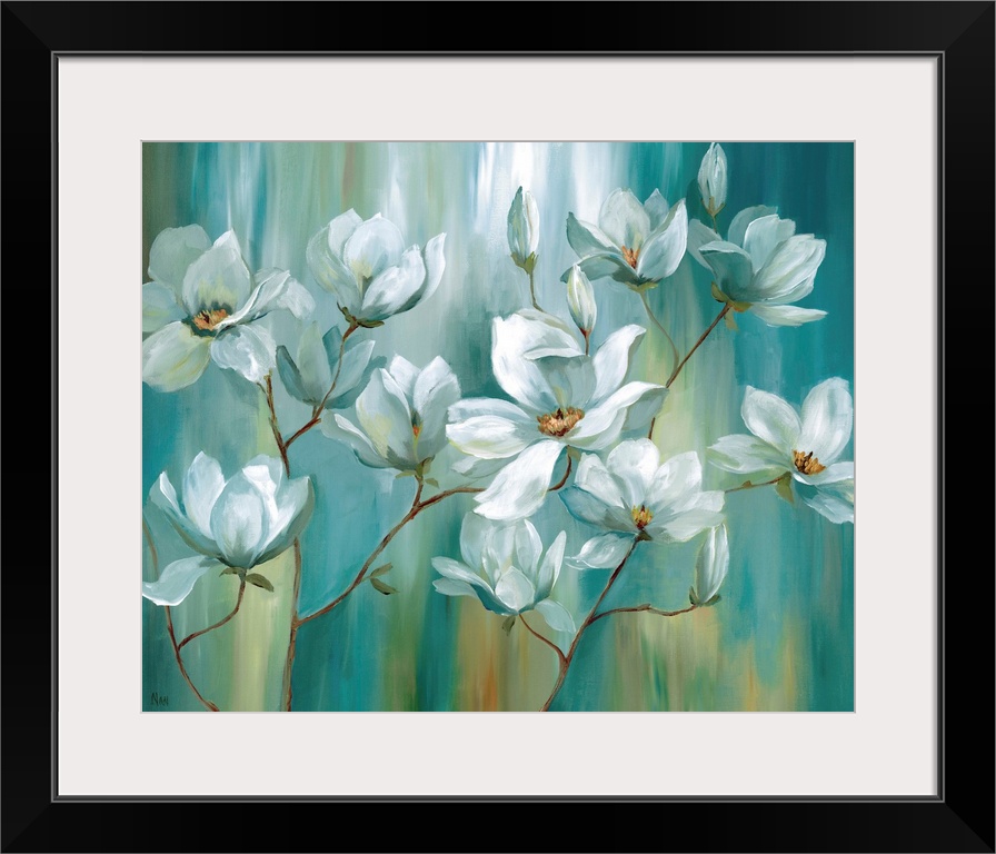 <p>Contemporary painting of white flowers on a vertically painted blue, green, white, and gold background.</p>