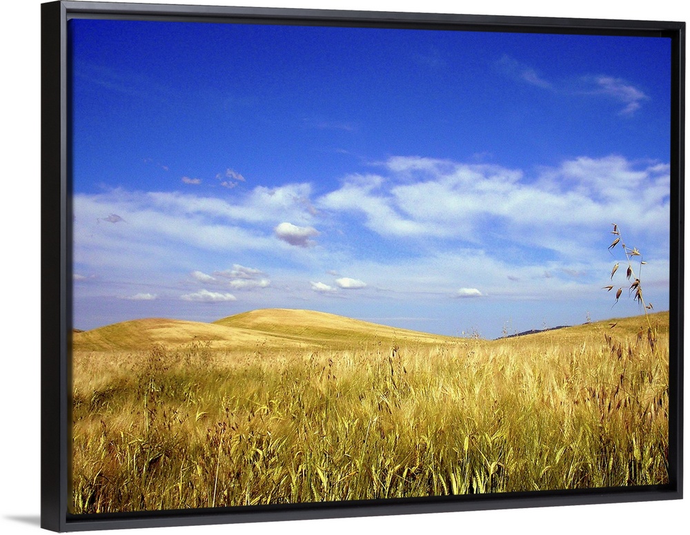 <p>Palouse wheat and grass fields with blue sky and clouds.</p>