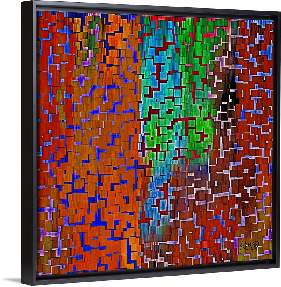 <p>Square abstract piece with tiny solid squares layered on each other to create a cracked look on a colorful background.</p>