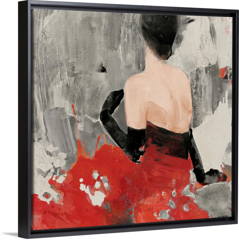 <p>Contemporary painting of a dark haired woman wearing a black ball gown with splashes of red and black paint around her.</p>