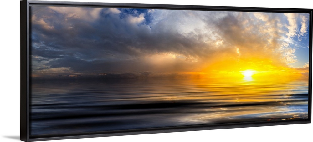 <p>A beautiful golden panoramic sunset reflected in the ocean waves at sunset with bright spiraling white clouds.</p>