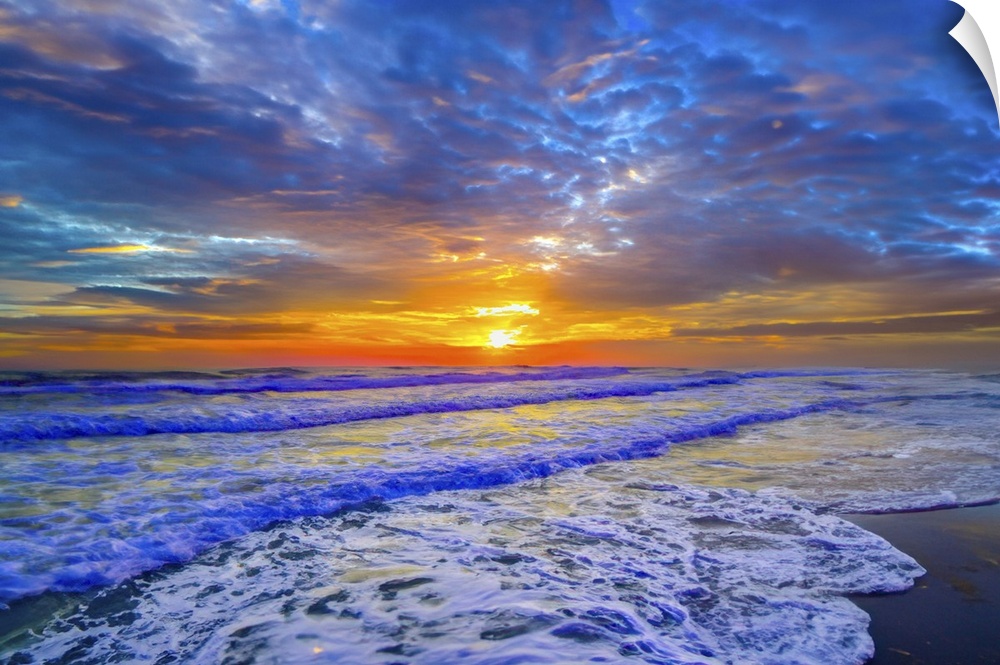 <p>Breaking lavender waves turn into white sea foam as they meet the shore. A beautiful lavender and blue sunset along the beach with colorful soft clouds.</p>