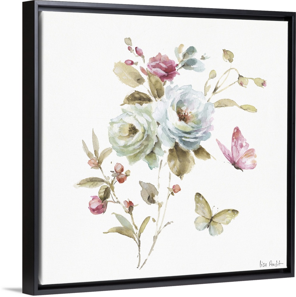 <p>Square watercolor painting of roses and butterflies.</p>