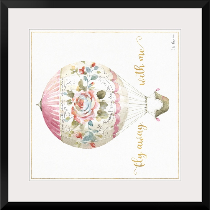 <p>Square watercolor painting of a pink and white hot air balloon with a rose on it and the phrase "fly away with me" written in gold beside it.</p>