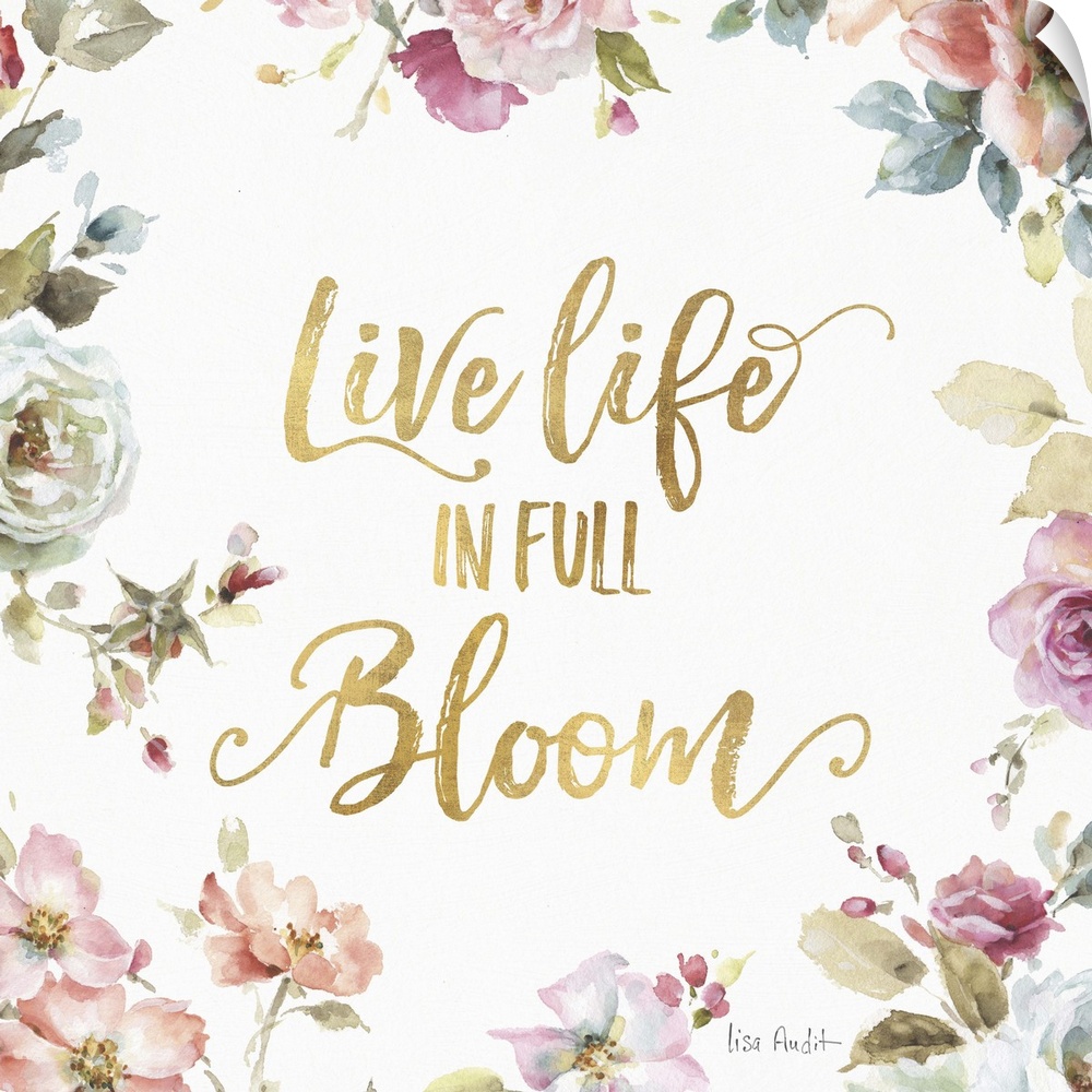 <p>"Live Life in Full Bloom" written in gold and surrounded by a watercolor floral print.</p>