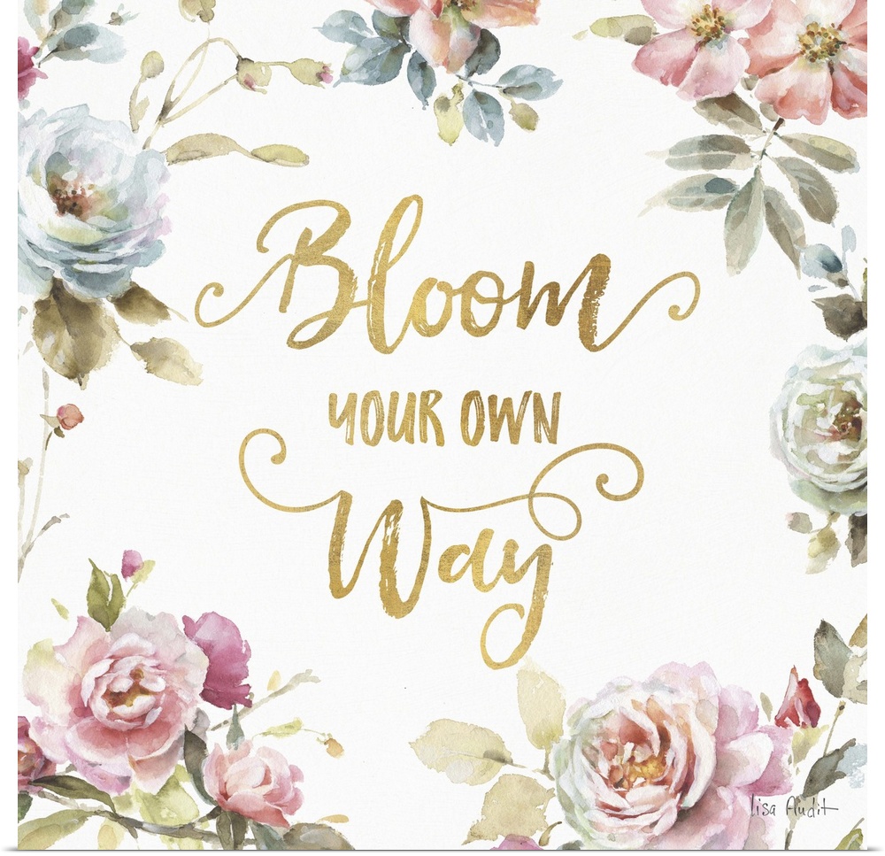 <p>"Bloom Your Own Way" written in gold and surrounded by a watercolor floral print.</p>